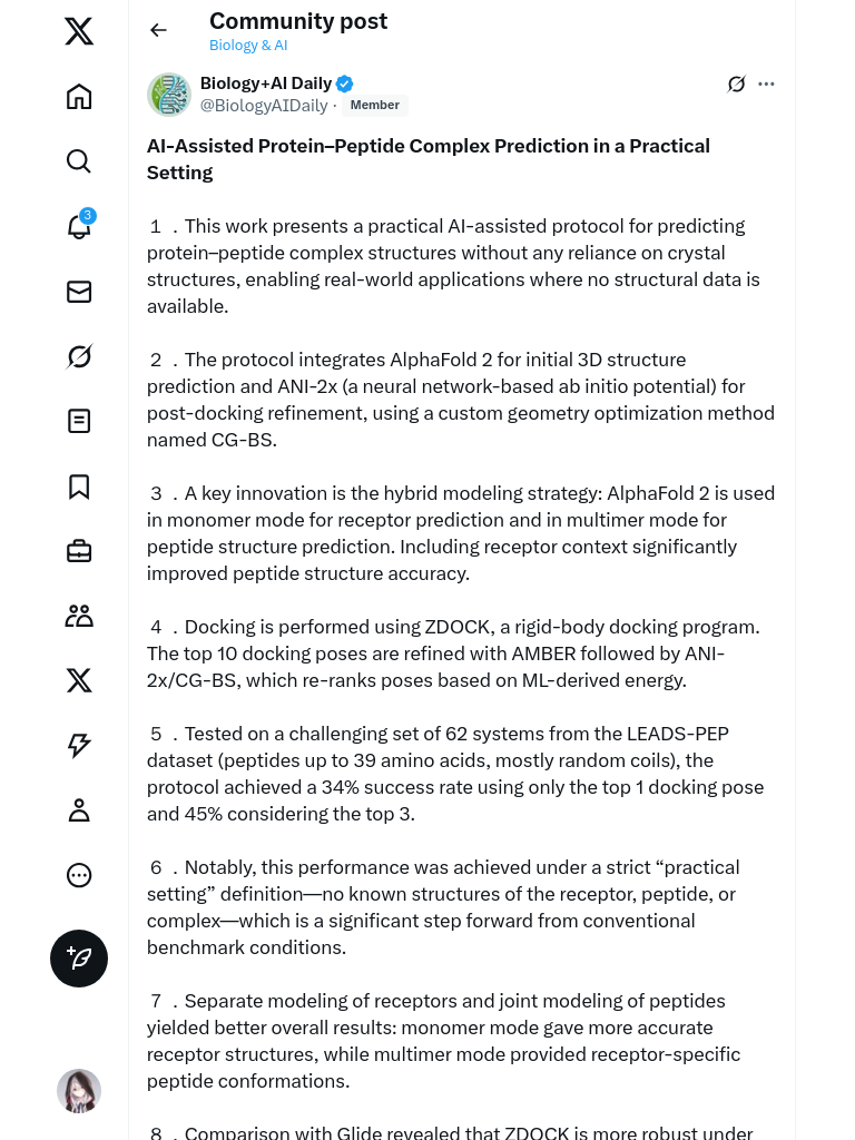 该研究提出了一种实用的AI辅助协议,用于预测蛋白质-肽复合物结构,无需依赖晶体结构,适用于缺乏结构数据的实际应用场景。该协议结合AlphaFold 2进行初始3D结构预测,并利用ANI-2x进行后对接精修,取得了较高的成功率。研究结果在缺乏已知受体、肽或复合物结构的严格实际应用条件下,表现出了较强的竞争力,发表于2025年06月01日