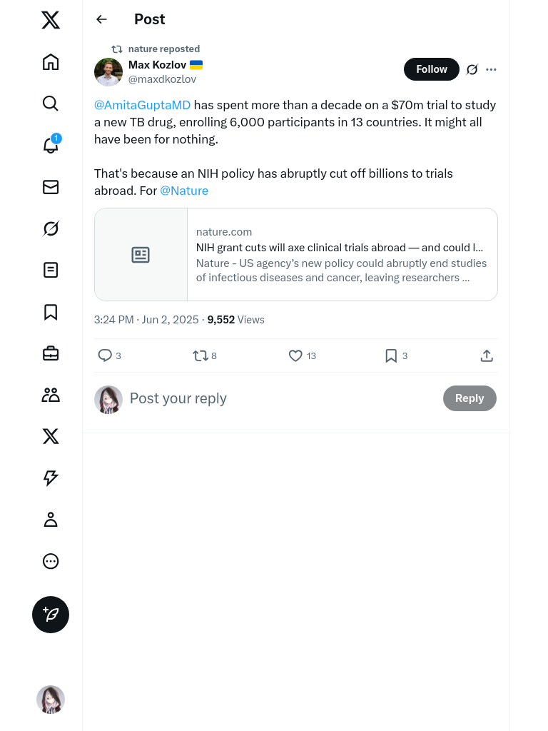 一项耗时十年、耗资7000万美元的结核病新药试验,由于美国国立卫生研究院(NIH)政策骤然中断对境外试验的资金支持,可能面临失败的风险。该试验在13个国家招募了6000名参与者。这项政策变化对全球结核病药物研发带来严重影响。发表于 2025年06月02日