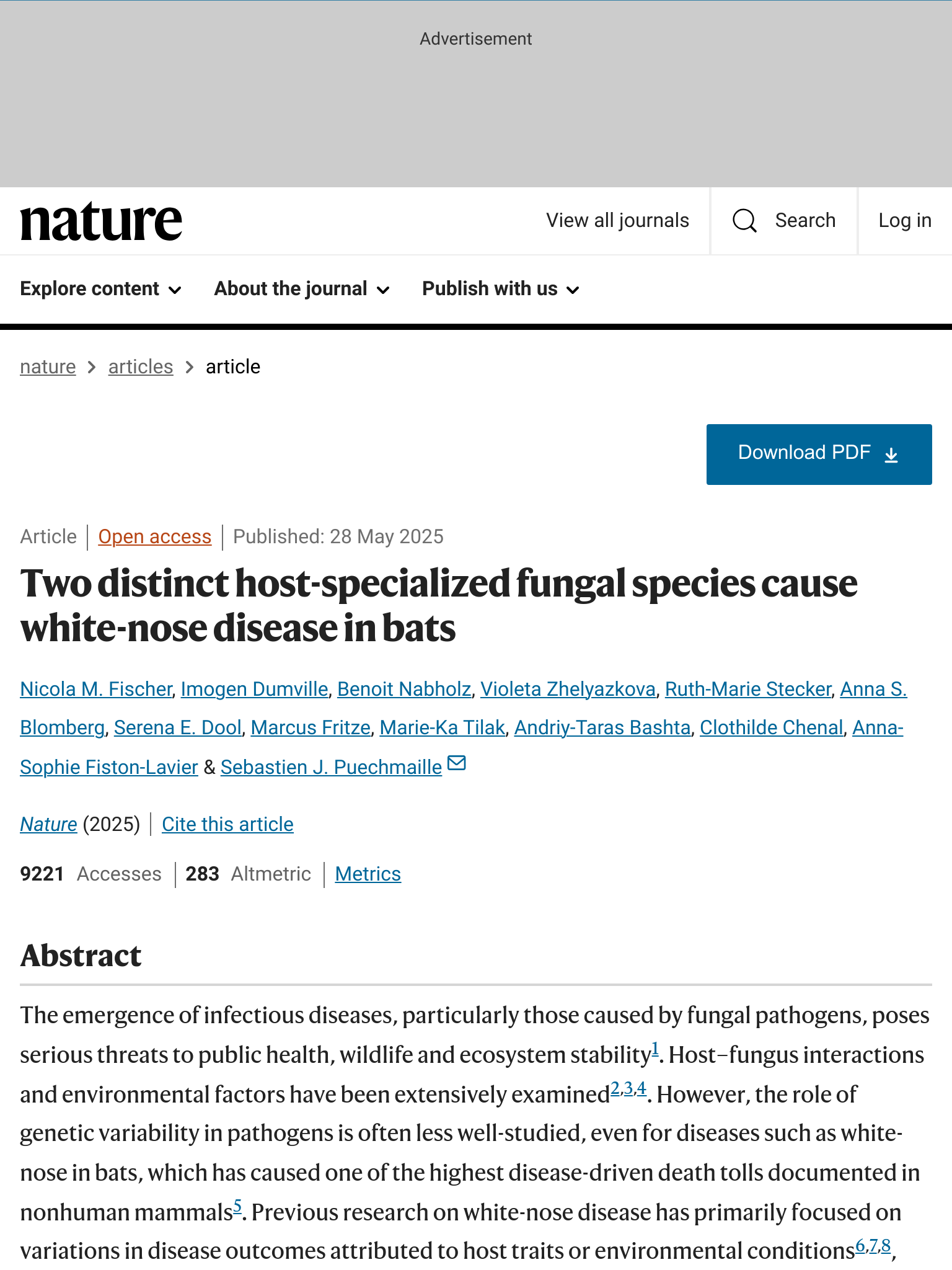 Nature研究论文 | Two distinct host-specialized fungal species cause white-nose disease in bats grit 发布于 2025-06-03 14 次阅读 该研究揭示了蝙蝠白鼻综合症是由两种不同的宿主特异性真菌物种引起的。研究结果强调了这些真菌对蝙蝠种群的特定致病机制。发表于 2025年06月02日 原文链接:https://go.nature.com/43u8Tcl