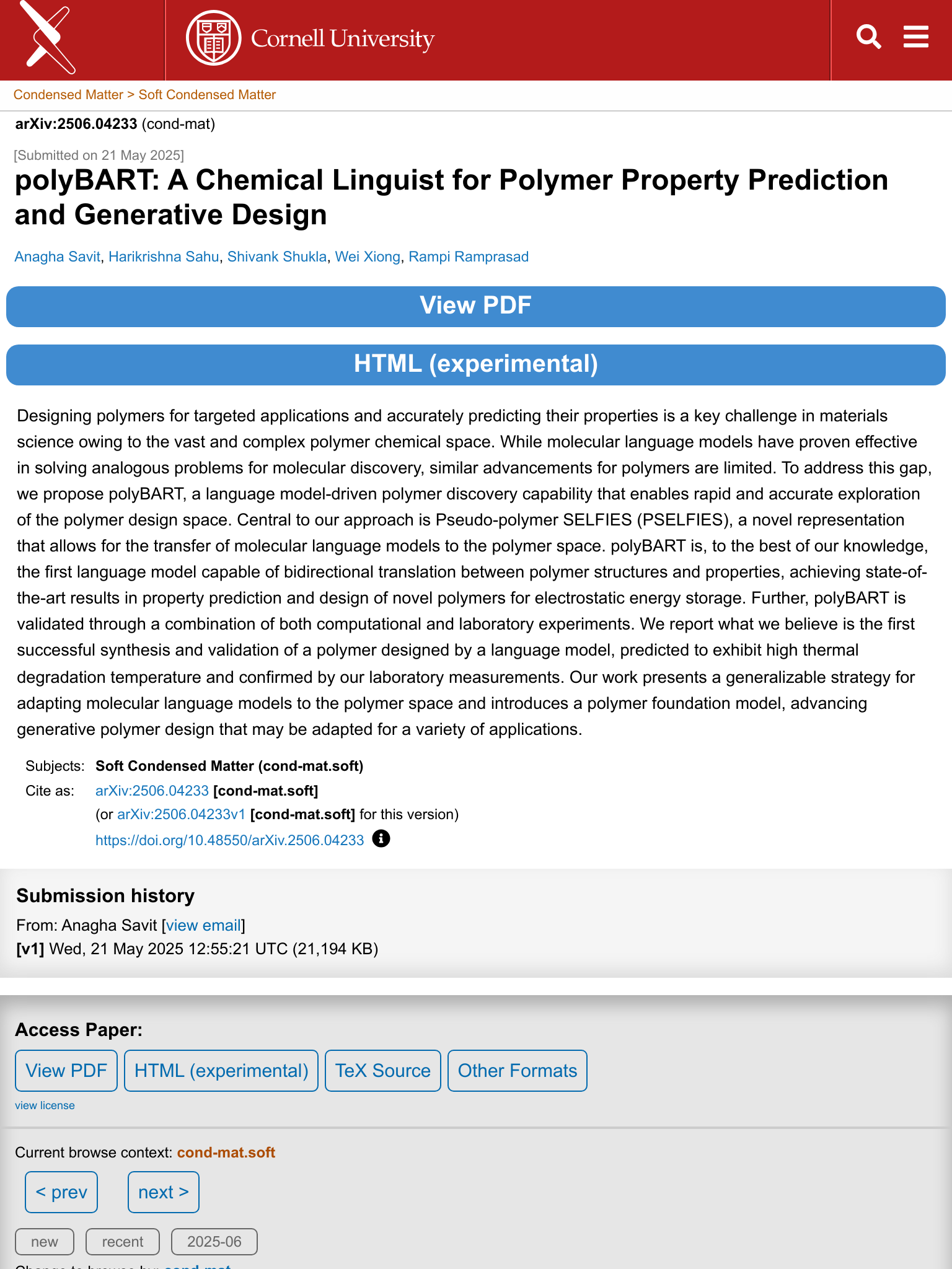 该研究提出了一种名为polyBART的新型聚合物基础模型,利用PSELFIES表示方法,结合现有分子语言模型,实现了聚合物性质的预测和生成设计。模型在预测聚合物热学和电子特性方面取得了最先进的结果,并成功合成并测试了语言模型设计的聚合物,验证了模型的准确性。发表于 2025年06月06日