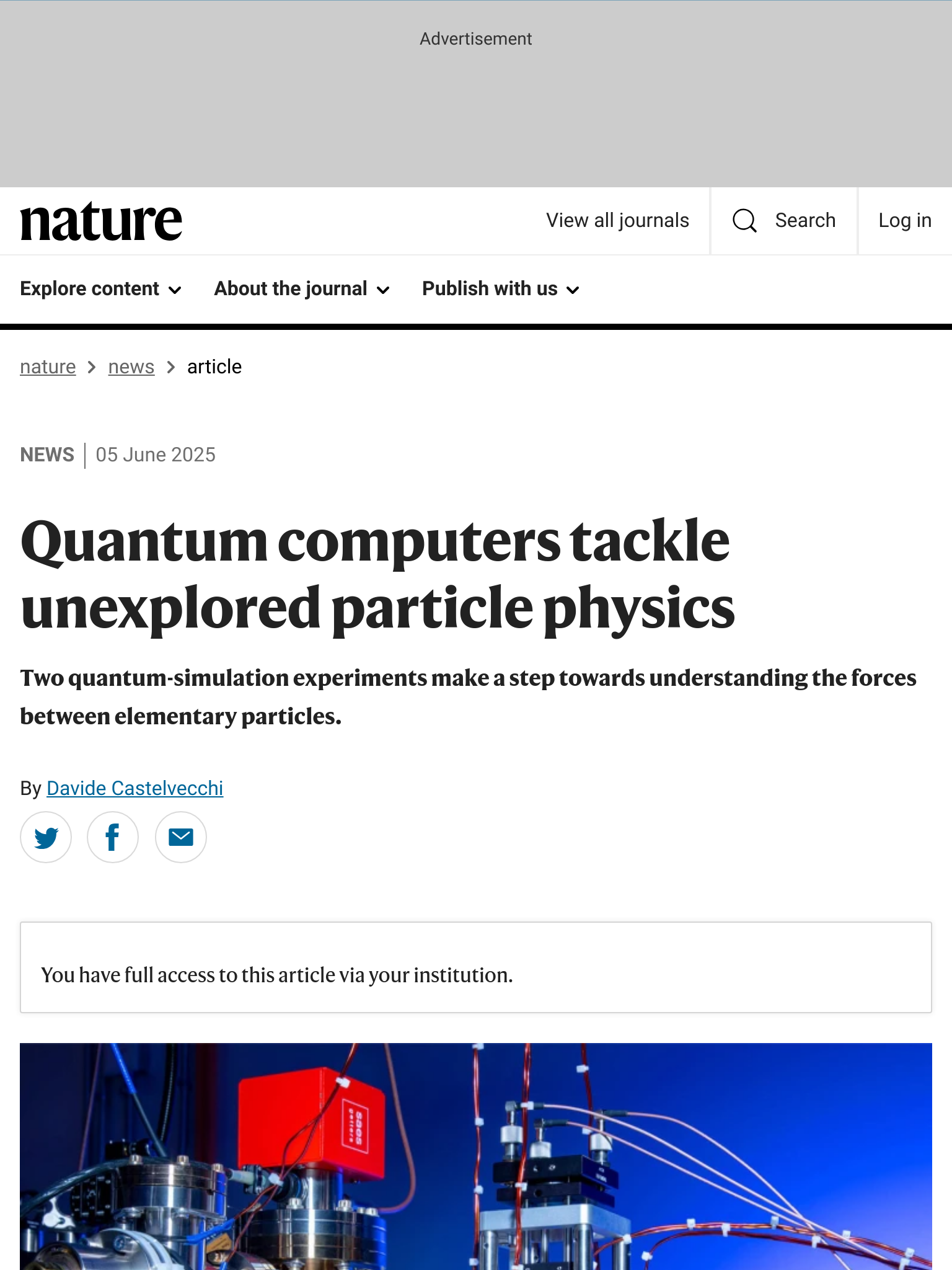 Nature新闻 | 两项量子模拟实验朝着理解基本粒子之间的力迈进 grit 发布于 2025-06-07 15 次阅读 两项量子模拟实验取得进展,为理解基本粒子间的相互作用提供了新的见解。实验结果有助于进一步完善粒子物理学理论框架。发表于 2025年06月06日 原文链接:https://go.nature.com/3HsrIE4